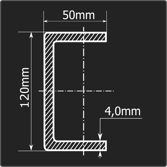 Швеллер стальной холоднокатаный гнутый равнополочный 120*50мм, толщиной 4,0мм и длиной 12м. Материал - углеродистая сталь. Соответствует требованиям ГОСТ 8278-83.