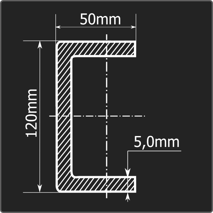 Швеллер стальной холоднокатаный гнутый равнополочный 120*50мм, толщиной 5,0мм и длиной 12м. Материал - углеродистая сталь. Соответствует требованиям ГОСТ 8278-83.