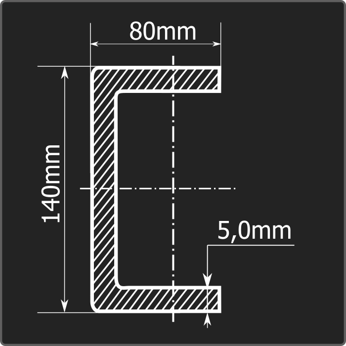 Швеллер стальной холоднокатаный гнутый равнополочный 140*80мм, толщиной 5,0мм и длиной 12м. Материал - углеродистая сталь. Соответствует требованиям ГОСТ 8278-83.