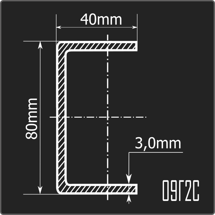 Швеллер стальной холоднокатаный гнутый равнополочный 80*40мм, толщиной 3,0мм и длиной 12м. Материал - низколегированная сталь. Соответствует требованиям ГОСТ 19281-2014.