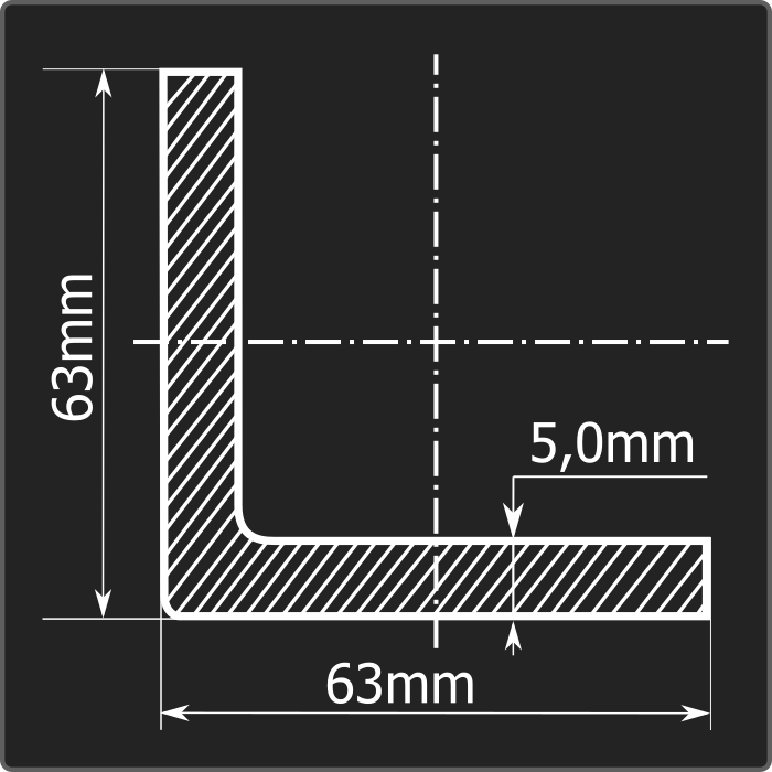 Угол стальной холоднокатаный гнутый равнополочный 63*63мм, толщиной 5,0мм и длиной 12м. Материал - углеродистая сталь. Соответствует требованиям ГОСТ 19771-93.