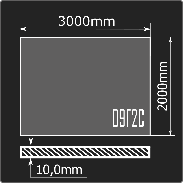 Лист стальной горячекатаный толщиной 10мм, шириной 2000мм и длиной 3000мм. Материал - низколегированная сталь. Соответствует требованиям ГОСТ 19281-2014.