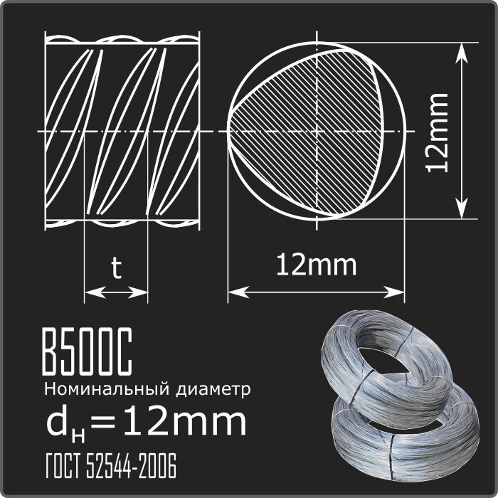 Арматурный прокат холоднодеформированный в мотках периодического профиля номинального диаметра dн 12,0мм класса В500 С (свариваемый). Расстояние между двумя соседними поперечными ребрами измеренное вдоль оси проката t = 6мм +/-15%. Соответствует требованиям ГОСТ 52544-2006.