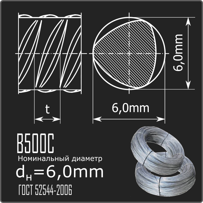 Арматурный прокат холоднодеформированный в мотках периодического профиля номинального диаметра dн 6,0мм класса В500 С (свариваемый). Расстояние между двумя соседними поперечными ребрами измеренное вдоль оси проката t = 6мм +/-15%. Соответствует требованиям ГОСТ 52544-2006.