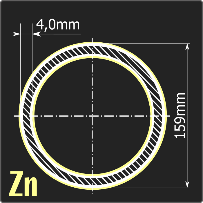 Труба электросварная стальная оцинкованная диаметром 159мм, толщиной 4,0мм и длиной 6м. Тип покрытия – горячее цинкование ГОСТ 9.307-89. Материал - углеродистая сталь. Соответствует требованиям ГОСТ 10705-80.