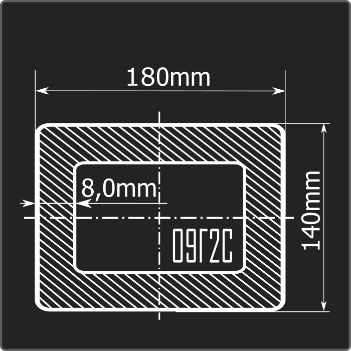 Труба профильная стальная прямоугольного сечения 180*140мм, длиной 12м и толщиной 8,0мм. Материал - низколегированная сталь. Соответствует требованиям ГОСТ 30245-2003. Стандартный пакет: вес - 5,251тн., количество - 12шт.