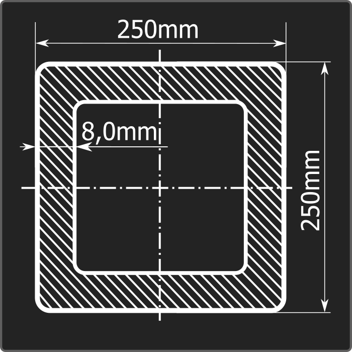 Труба профильная стальная квадратного сечения 250*250мм, длиной 12м и толщиной 8,0мм. Материал - углеродистая сталь. Соответствует требованиям ГОСТ 30245-2003. Стандартный пакет: вес - 2,836тн., количество - 4шт.