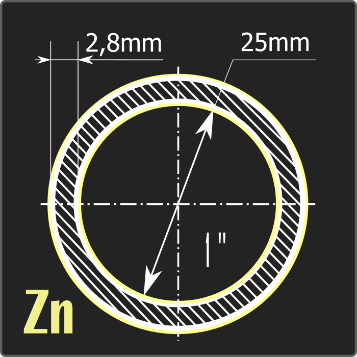 Труба стальная водогазопроводная оцинкованная внутренним диаметром 25мм, толщиной 2,8мм и длиной 6м. Тип покрытия – горячее цинкование ГОСТ 9.307-89. Материал - углеродистая сталь. Соответствует требованиям ГОСТ 3262-75.